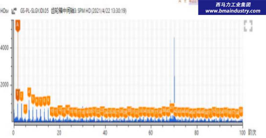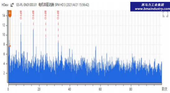 减速机电机端轴承冲击脉冲频谱图如下,存在转频及其谐波,轴承受外力所致,属早期。