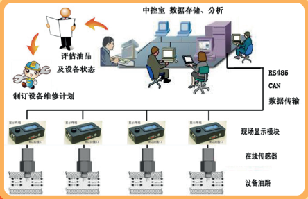 油品在线监测系统由在线传感器、现场显示模块、数据传输模块、工控机 (DCS/PLC)、分析软件等组成,将在线传感器安装 在润滑油管路上、实时采集油品相关信息,采集的信息通过 RS485、CAN、Modbus 等方式传输到工控机(DSC/PLC),由分析 软件集中分析处理。 分析软件具有:监测数据实时显示、、实时趋势显示、自动生成报告、历史数据存储、历史数据查询、报警值设定、实时报警输 出、历史报警查询等功能。