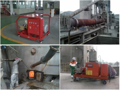 以高压柱塞泵作为动力源,通过水泥行业应用 喷嘴,用加长耐高温枪杆将高压水射入窑尾内壁结 皮内,利用水在高温高压状态下急剧膨胀,产生巨 大冲击力,在高温物料内水骤然汽化而产生爆炸, 被击中的部分物料全被震动而垮落,将结皮除掉, 此设备在水泥行业俗称“水炮”,在不停窑时也可 以清除结皮,不会对窑温和耐火砖造成任何影响。