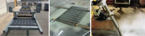 ♦滑撬清洗间用高压喷枪清理电泳间滑撬及喷漆间滑撬上的干漆,采用参 数压力250MPa,流量15Lmin,清洗喷漆间滑撬表面单组份或双组份漆; ♦清洗喷漆室格栅板上的漆渣,及吊具等清洗,采用压力lOOMPa,流量 40L/mino