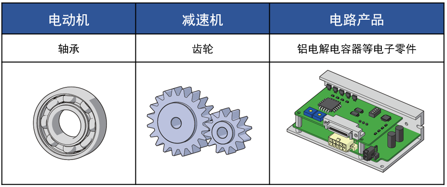 影响电动机整体使用寿命的零部件主要有三种。分别对应电动机、减速机和电路产品。