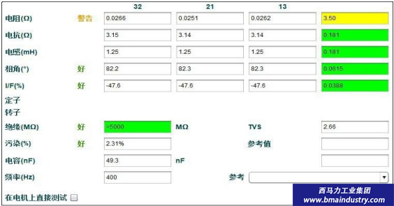 检测结果:该电机定子绕组正常无异常,但三项阻值偏差较大,建议电机运行前检查电机引线连接牢固,防止出现虚接问题。