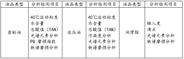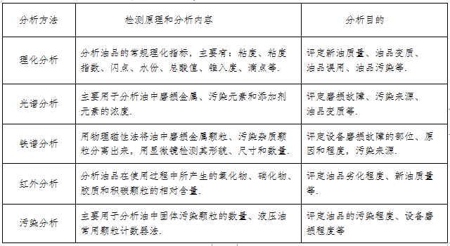 油液检测是由多种油液分析办法组成,主要有理化分析、光谱分析、铁谱分析、红外分析和污染分析等。见下表;
