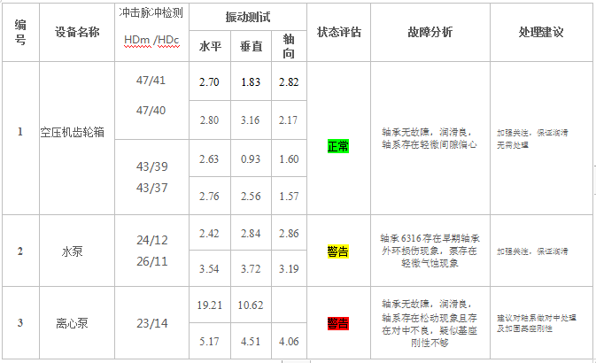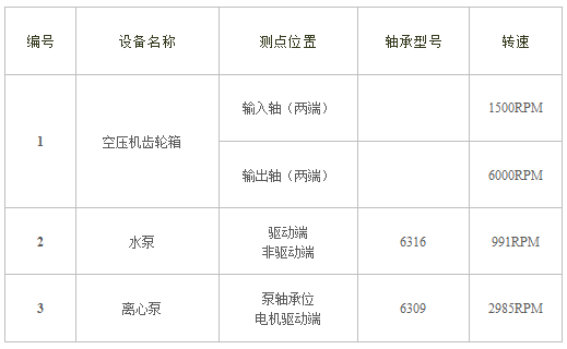 本次测试中采用了SPM应用的冲击脉冲高清技术和振动高清包络两种测试手段,分别测量了1台空压机齿轮箱和2台泵的数据。