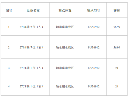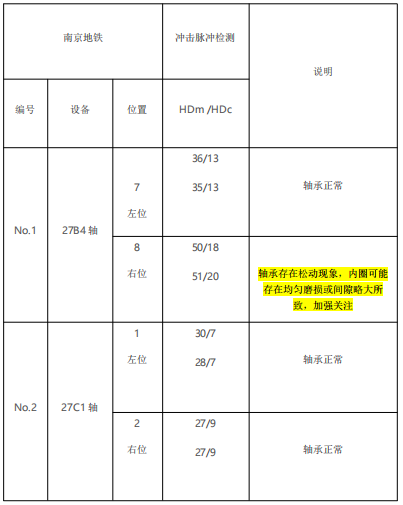 采用振动分析仪器 Leonova Diamond 对某地铁 27B4 轴和 27C1 轴 4 个轴承进行了检测。 本次测试中采用了 SPM 应用的冲击脉冲高清技术的数据。 HD 高清冲击脉冲技术(采用 HD 冲击脉冲测试,可以提早到 3-6 个月发现轴承的故障,预知轴承的早 期、中期、晚期故障,润滑是否良好;通过 HD 冲击脉冲频谱分析,很容易分清是轴承问题还是安装 问题)
