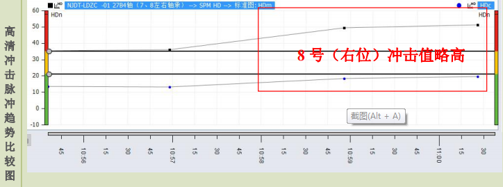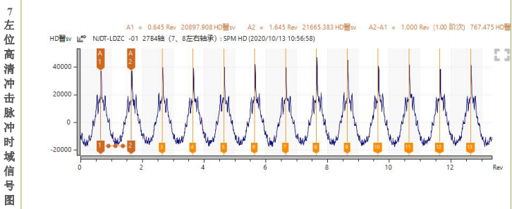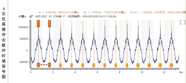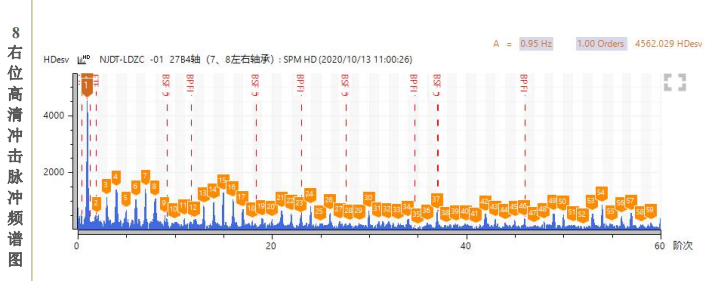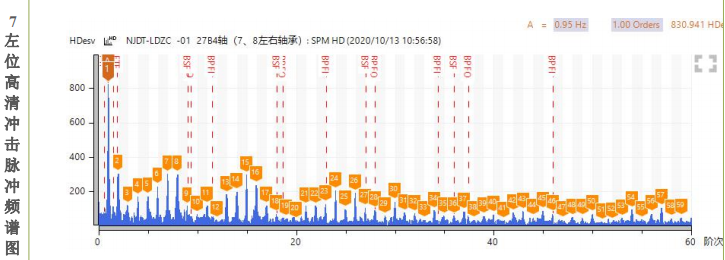 数据分析:4 轴两个轴承趋势数值比较 8(右位)冲击值略高,7 号和 8 号轴承的高清冲击脉冲频谱中均 未发现轴承部件故障频率信号匹配,润滑良,频谱中主要成分为转频及其谐波信号为璇轮机 工作时正常的转频冲击,时域信号为转频的周期性冲击,8 号轴承冲击值略大为轴承内圈均 匀磨损或间隙略大所致。