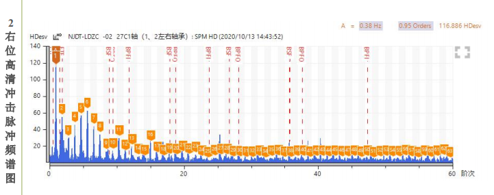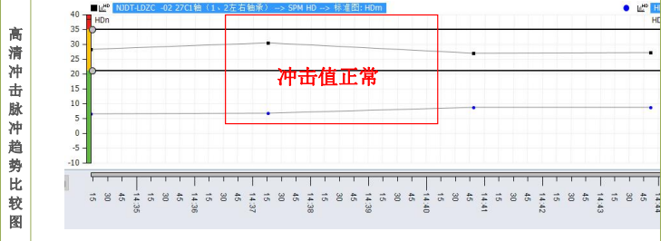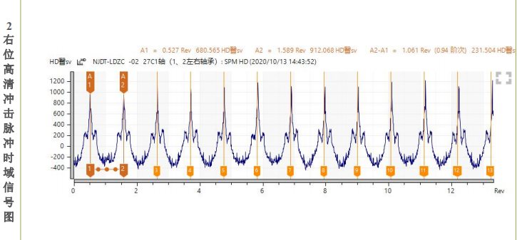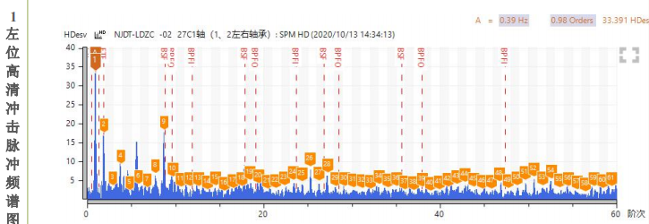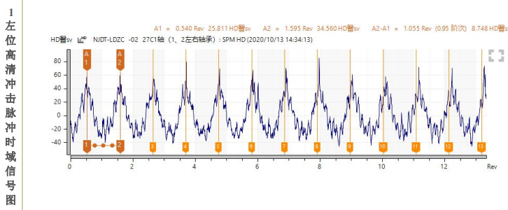 1 轴两个轴承趋势数值均比较正常,1 号和 2 号轴承的高清冲击脉冲频谱中均未发现轴承部 件故障频率信号匹配,润滑良,频谱中主要成分为转频及其谐波信号,为璇轮机工作时正常 的转频冲击,时域信号为转频的周期性冲击。