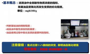 将一定量的油品中加入已知颜色的标准试剂中,由于油液中酸性物质的存在,导致标 准试剂颜色发生变化。然后再滴入碱性物质中和油液中的酸性物质,当油液中的所有 酸性物质被中和后,标准试剂的颜色又恢复初始颜色。通过滴入碱性物质的含量就可 以计算出油液中酸性物质的含量,即油液的总酸值( TAN )。